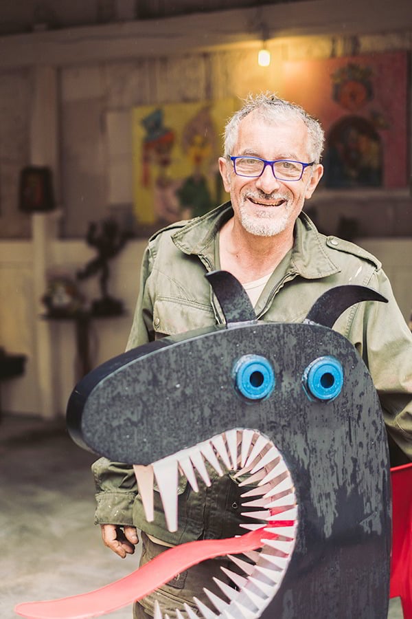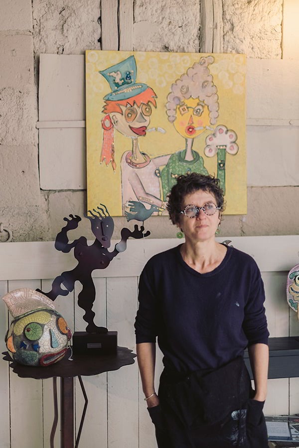 De la couleur Sophie en applique sur les murs, sur les personnages, de la céramique à la peinture sur toile, des sculptures végétales, tout leur petit monde vit bien, tout proche de leur maison. «Pas Sage à l’Art» : c’est le slogan apposé sur l’entrée de l’ancienne forge. Après avoir passé la porte, on peut jouer à la marelle peinte sur le béton d’origine, avec un ciel bleu, bien entendu. Deux grands oiseaux en métal rouillé signés Giovanni vous accueillent. Ce tandem a d’autres projets, comme celui d’ouvrir un des hangars et d’y installer un four, monter un atelier d’été dans un autre dédale près d’un petit jardinet, et puis du côté rue. On ne pourra plus passer sans remarquer cette adresse, avec un décor sur toute la façade, tonique, amusant, joyeux. Les T’Art’Empions s’afficheront entre la porte et les volets !