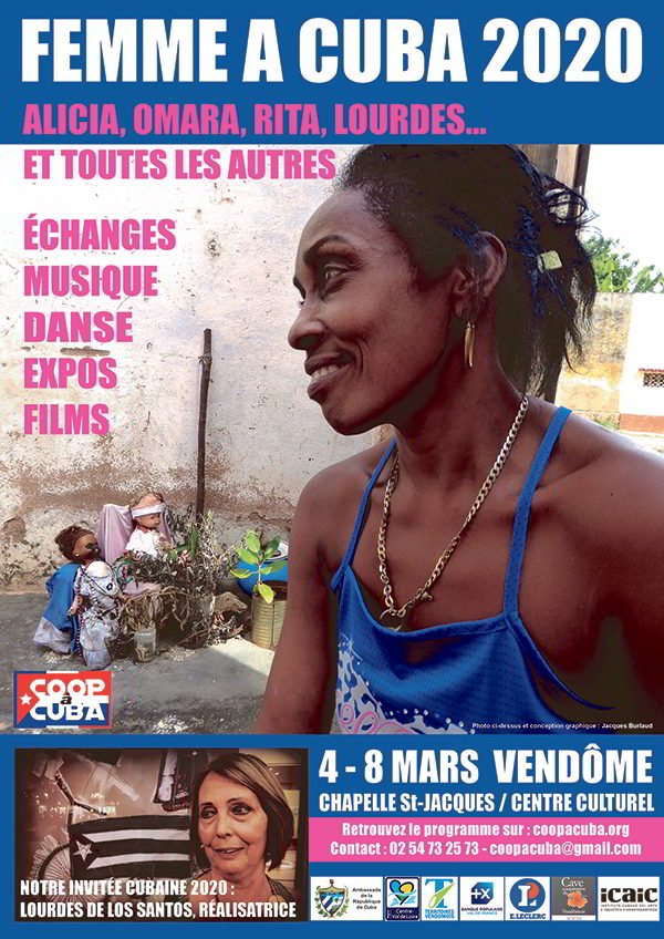 Samedi 7 mars, 19h, Chapelle Saint-Jacques : soirée «Femme à Cuba 2020». Présentation du film par Lourdes de Los Santos. Projection “Copa y espada”. Échanges avec la réalisatrice. Service à table de collation et boissons. Spectacle de Tambours Bata et d’une danseuse sur les rituels de la santeria. Entrée : 12€, 10€ (sur réservation au 02 54 73 25 73 ou coopacuba@gmail.com)