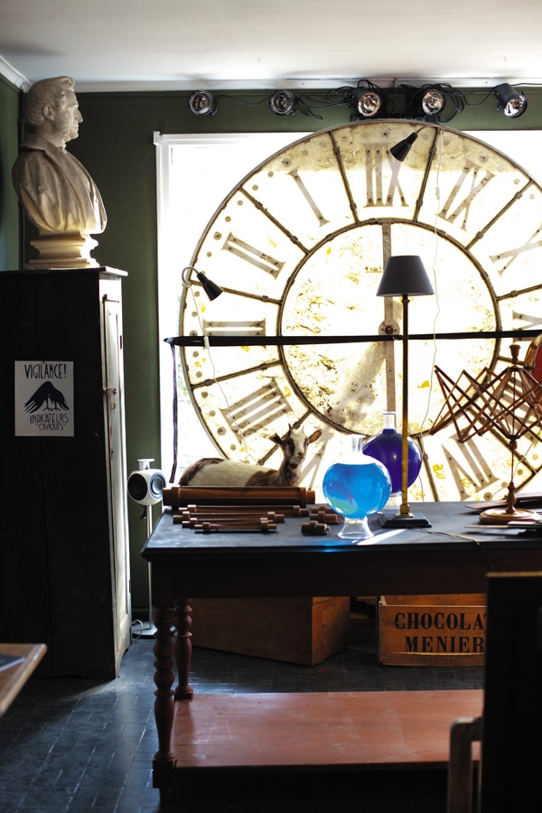 Ce collectionneur d’objets rares ou en phase de le devenir, traque, chine une ancienne horloge Bodet de 2 mètres par 3 – le fabricant leader de l’affichage horaire remplit une des vitrines. Des bustes et portraits en plâtre donnent envie de découvrir les lieux ainsi que l’accumulation des collections de coquillages, de fossiles, de boîtes, de plaques et de bouts de ficelle sous globe. Comme Grégoire adore les voitures anciennes – un héritage familial – dans l’une des vitrines on peut voir une vieille jeep et peut-être que demain pour les 24 heures du Mans il y aura une Aston Martin ? Qui sait !