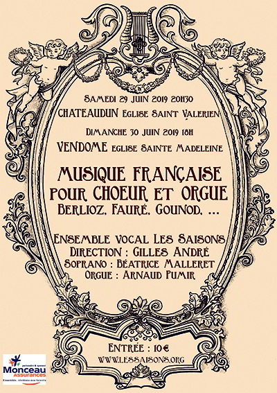 Musique française du XIXe siècle pour choeur et orgue samedi 29 juin à Châteaudun et dimanche 30 juin à Vendôme.