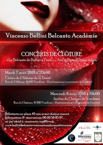 Outre ses concerts de clôture de l’Atelier d’été, le mardi 7 août au cloître de l’abbaye de la Trinité de Vendôme et le mercredi 8 août dans les jardins du château de Vendôme, la Vincenzo Bellini Belcanto Académie reprend ses quartiers d’été au sein du Campus de Monceau Assurances à Vendôme.