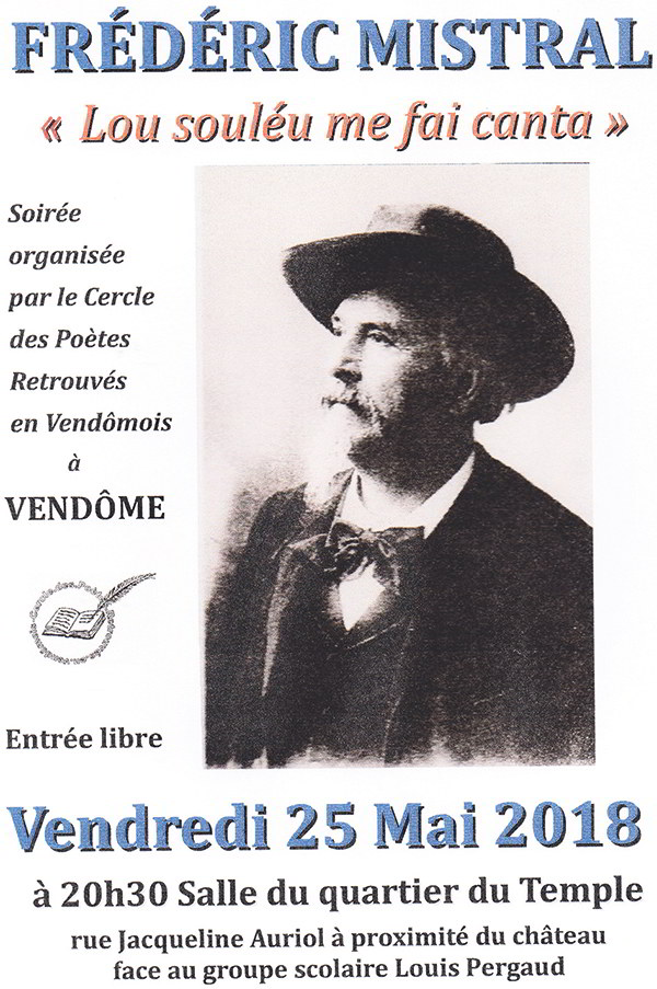 Le Cercle des poètes retrouvés en Vendômois présentera le vendredi 25 mai, à partir de 20h30, à salle du quartier du Temple, à Vendôme, une soirée consacrée au poète provençal Frédéric Mistral.