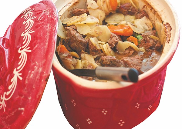 – Egoutter la viande (et garder le jus !) et dans une terrine alsacienne ou dans une grande cocotte en fonte beurrée, disposer une couche d’oignons, la moitié des pommes de terre, les carottes, les viandes, les poireaux et finir par l’autre moitié des pommes de terre. Saler et poivrer à chaque couche !