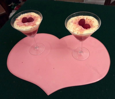 Avant de servir, saupoudrez les verrines avec les biscuits en poudre et décorez avec quelques framboises et un biscuit rose.